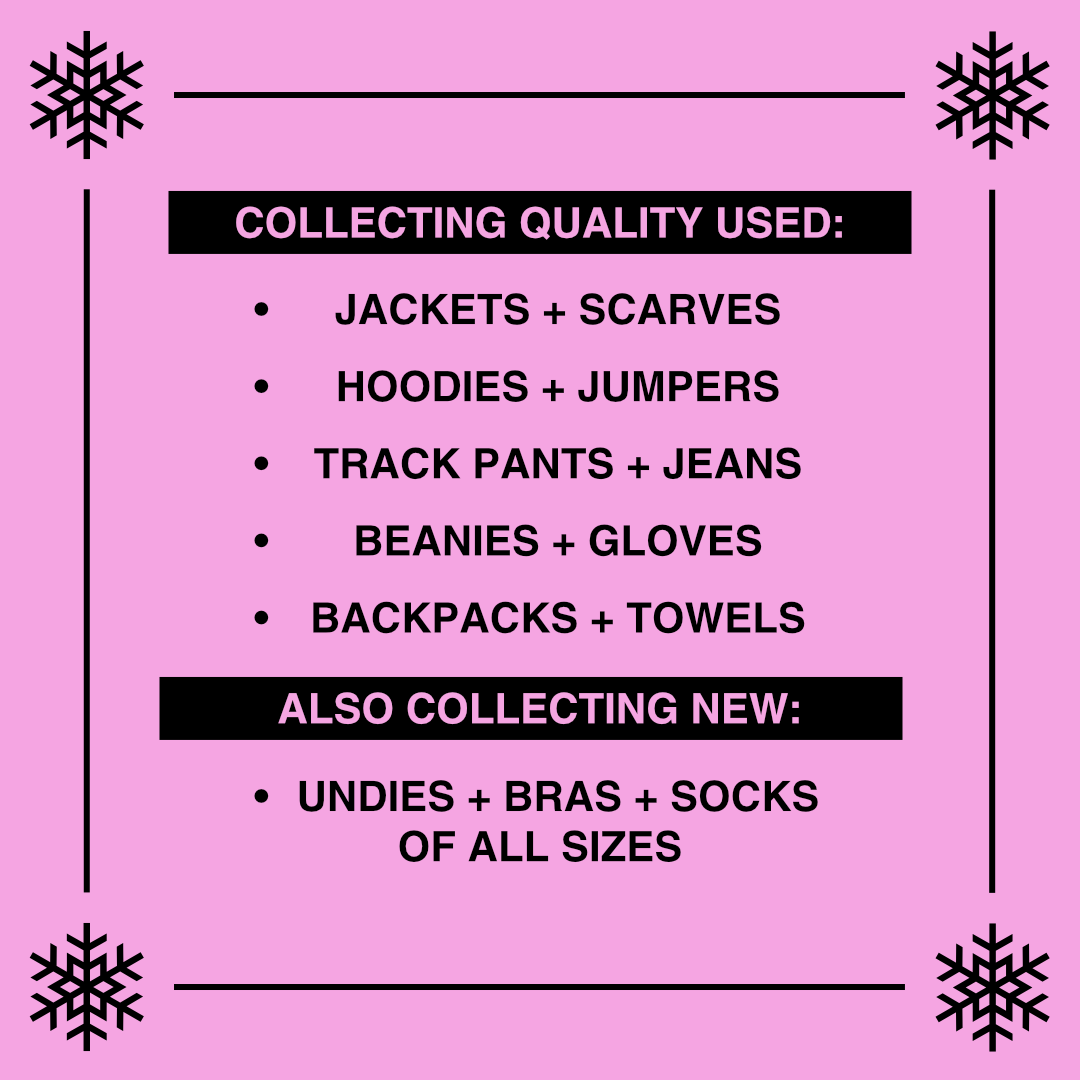 For the next two weeks we will be doing a clothing drive for Wayside Chapel, who look after those less fortunate across Sydney. We are looking for winter clothes ONLY. Stuff that you maybe don’t wear anymore but is still in good condition, as well as NEW things like underwear (S-XXL & 8-24) and toiletries. Plus sized bras also encouraged. Last day to drop off will be Saturday 8th June. If you have any questions, please send us a message!